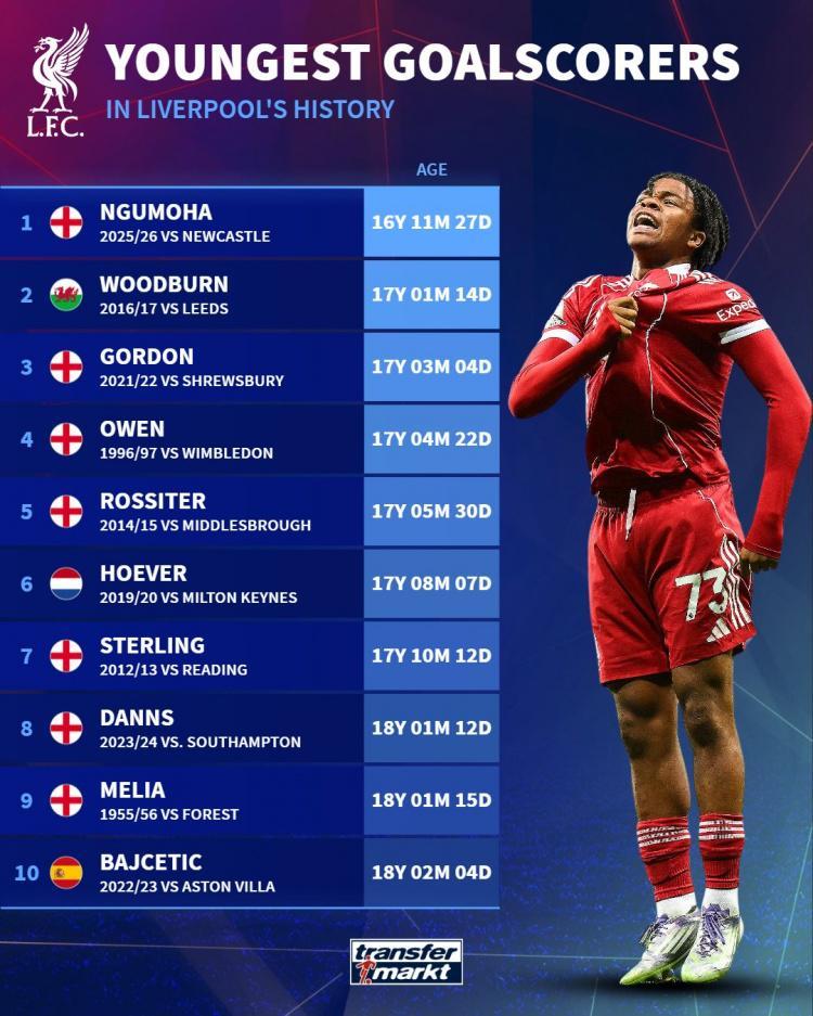 此役16岁小将恩古莫哈在终场补时阶段为利物浦攻入绝杀进球,据德国转会市场统计,他是利物浦队史最年轻的进球者。